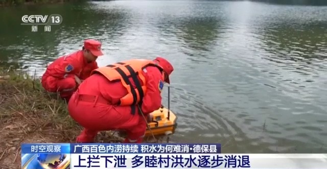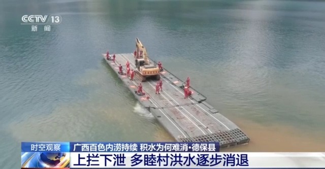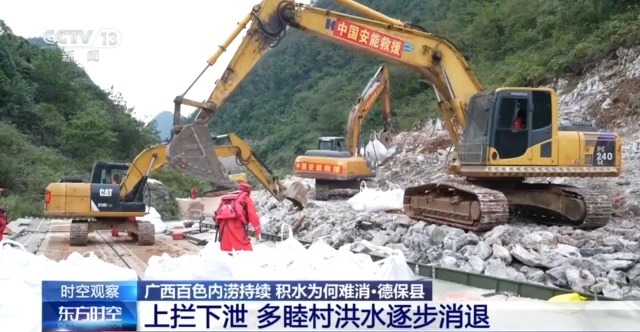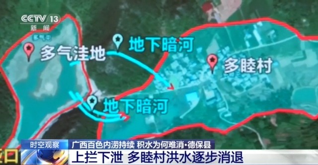 中国安能一局百色洪涝灾害抢险指挥长由淑明介绍,排水下降比较慢,还是受近期降雨影响,德保和靖西地区地下水位整体抬升,好多下泄的溶洞受到地下水的抬升以后形成一个顶托,下泄就比较慢。